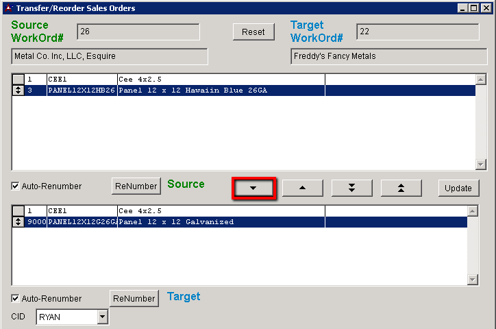 2. When the line item that needs to be transferred is selected, click the single down arrow button to drop it down to the target sales order.