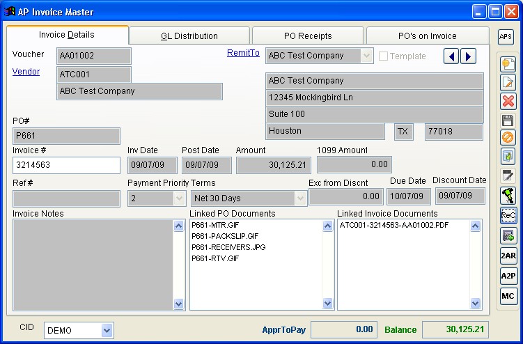 AP Invoice Master Screen |