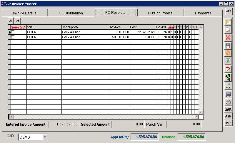 AP Invoice Master PO Receipts Tab |