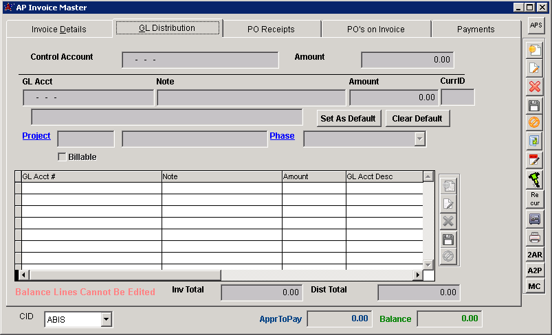 AP Invoice Master GL Distribution Tab |