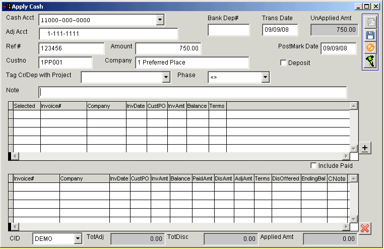 The Apply Cash Receipts screen is used to enter cash receipts and apply them against open AR invoices.