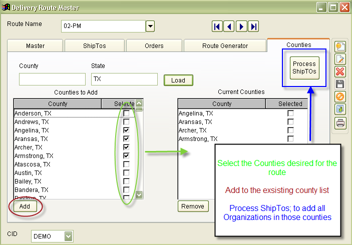 Predetermined counties and territories can be linked to a delivery route