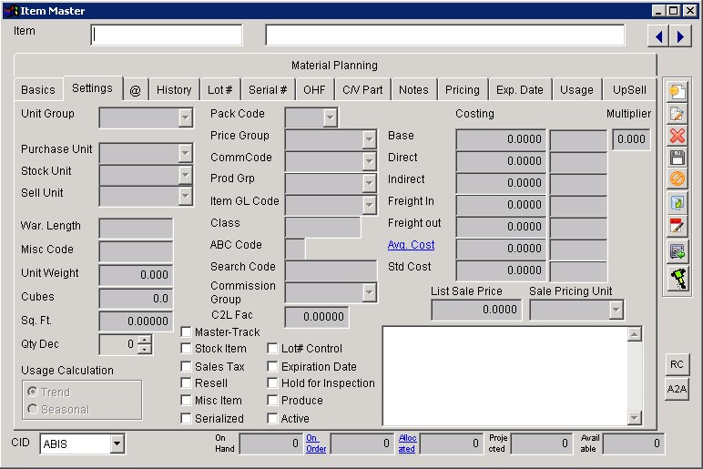 Item Master - SettingsSettings tab is used to maintain the item's main properties.