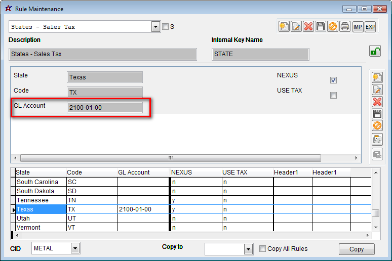 The States Rule (STATE) allows you to specify a GL account per state.