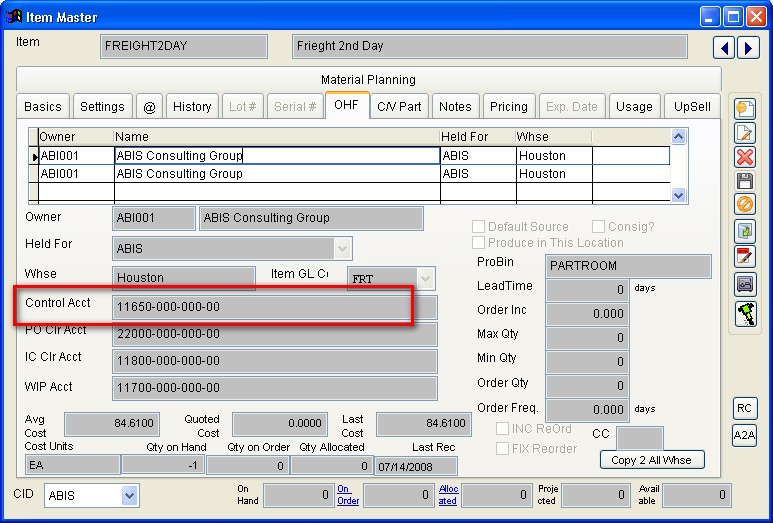 OHF tab of the Item Master will be credited when the item is invoiced.