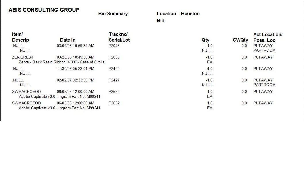 Bin Summary Report shows the item, date, serial/lot, quantity, weight and location of the item transaction.