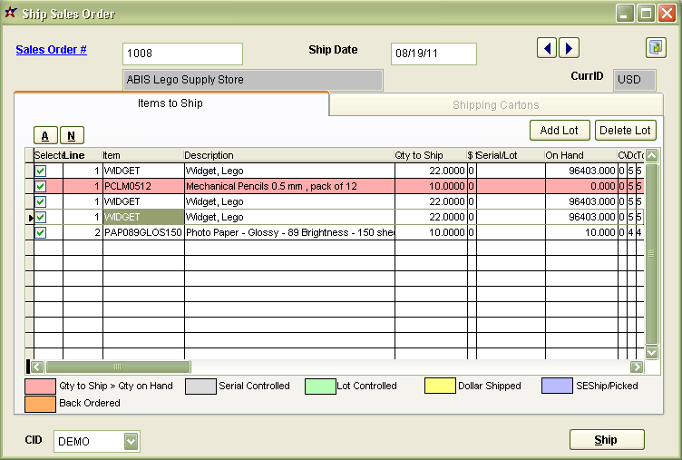 Function The Ship Sales Order screen is used to ship and invoice line items on open sales orders.
