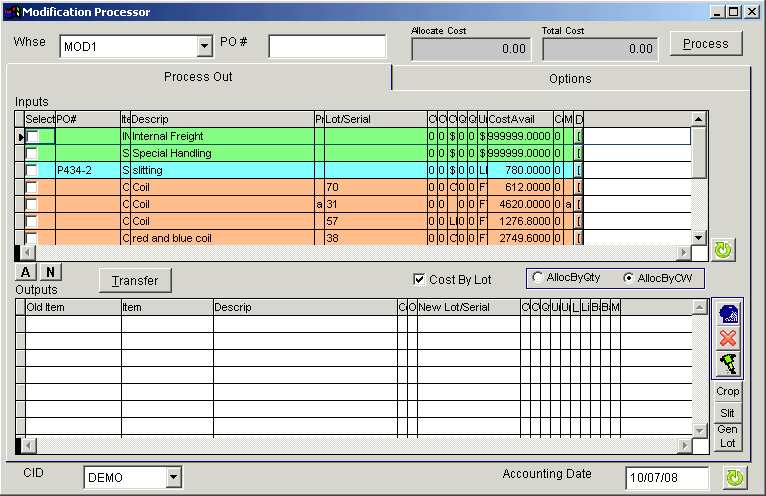 The outputs of the processing are three new coils of a different part number, COIL2, that have the total cost of $1620 split amongst them according to their new quantities.