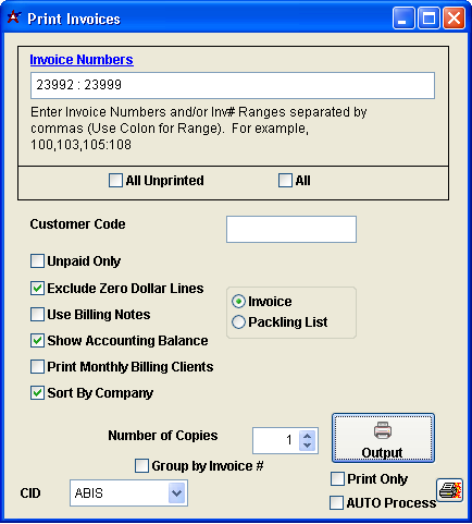 All Unprinted: Check this box to print ALL invoices that have not yet been printed/processed. Checking this box will make the program ignore the invoice number range.