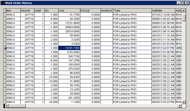 PWOREPORT rule.Work Order History: The work order history screen can be accessed by pressing Shift + F11.