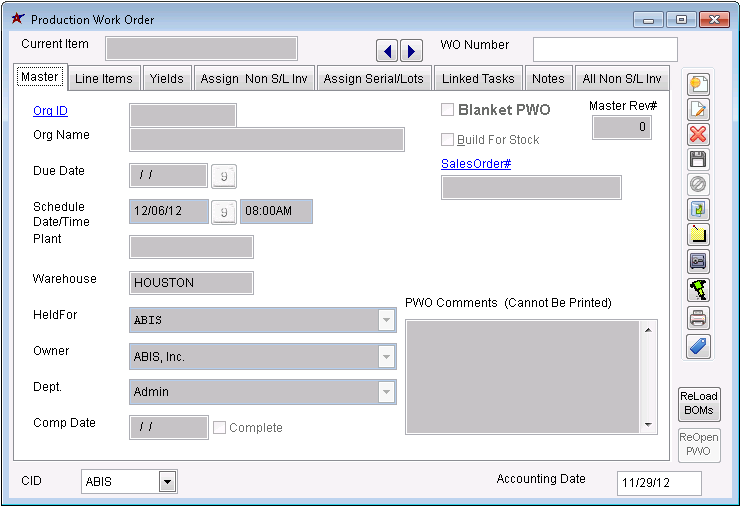 Default Menu Location: Transaction >> Production >> Production WO Master