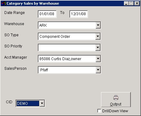 Category Sales by Warehouse report shows you a sales report broken down by account managers and warehouse locations.