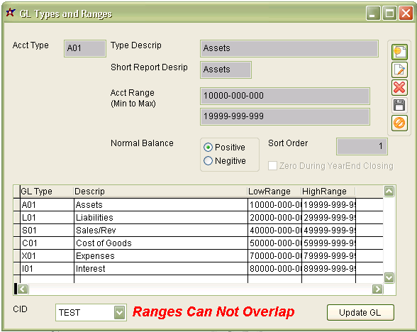 Function The GL Ranges can be viewed and edited from this screen. These Ranges define the categories of the General Ledgar and how the Types are broken down in reporting.