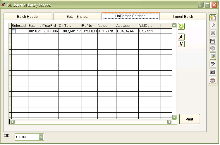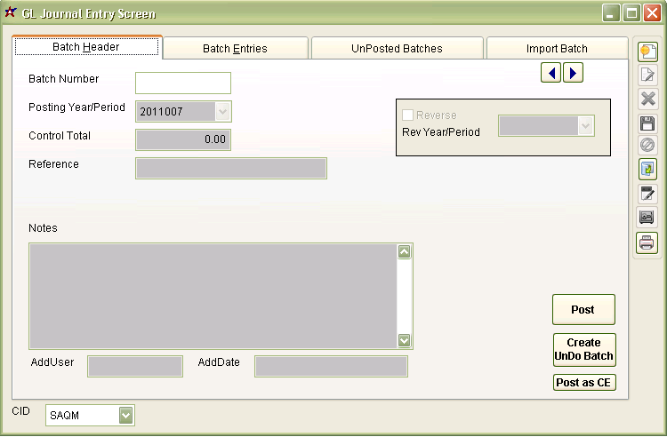 GL Batch Entry Tab |