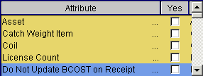 Do Not Update BCost on Receipt: Select this attribute if you want the base cost of the item to remain fixed, no matter what price the item is received at.