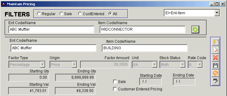 Maintain ==> Item Control ==> Customer PricingThe Maintain Pricing screen is used to create and maintain item pricing rules.