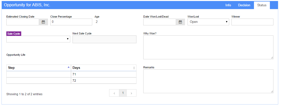 The decision tab is where you put in the details of the potential client/contract decision. You can also include decision makers or contacts that will help you win this opportunity from the inside.