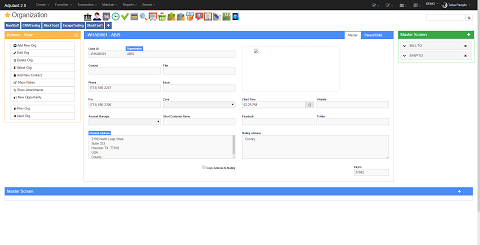 Function: The Organization screen lists all organizations’ key information. Users can also edit existing and add new organizations. (An organization is defined in Adjutant as any customer, vendor, supplier, company, prospect, address, location, etc that has a relationship with your company.)