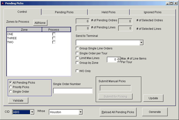 Zones to Process: To send a picklist to a wireless hand-held scanner, first either check the Process box next to the appropriate zones of the warehouse or click the