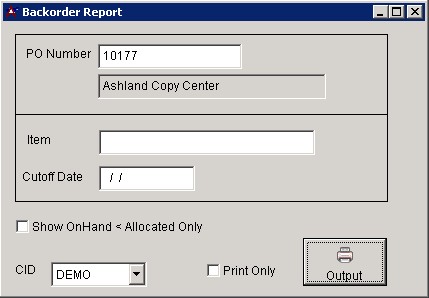 Backorder Report screen allows users to generate a back-order report either by using a PO number or an Item and the cut off date.