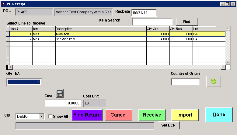 Function The PO Receipt Screen is used to receive the items listed on open purchase orders. This screen is also frequently accessed from the Purchase Orders screen by clicking the PO Rec button.
