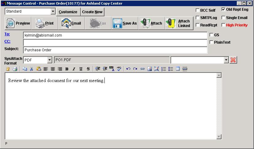 Message control screen allows user to send emails, attach documents, preview reports, print, and etc.
