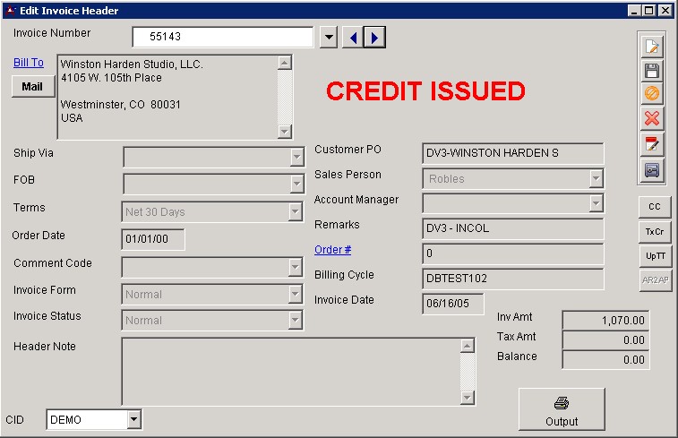 Edit Invoice Header Screen