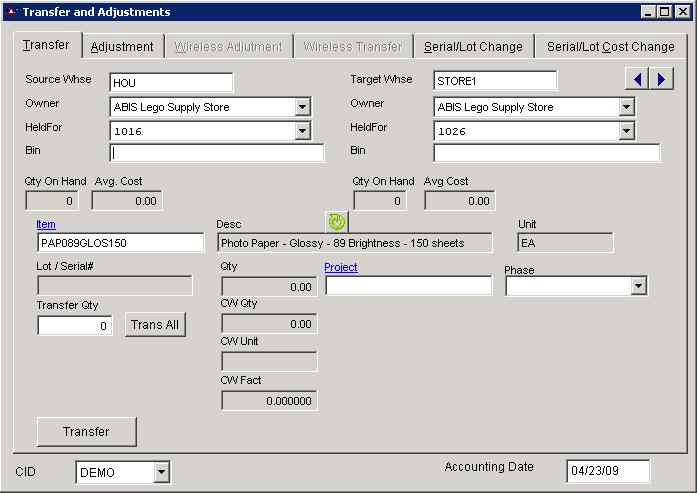 Transfer and Adjustments screen or the