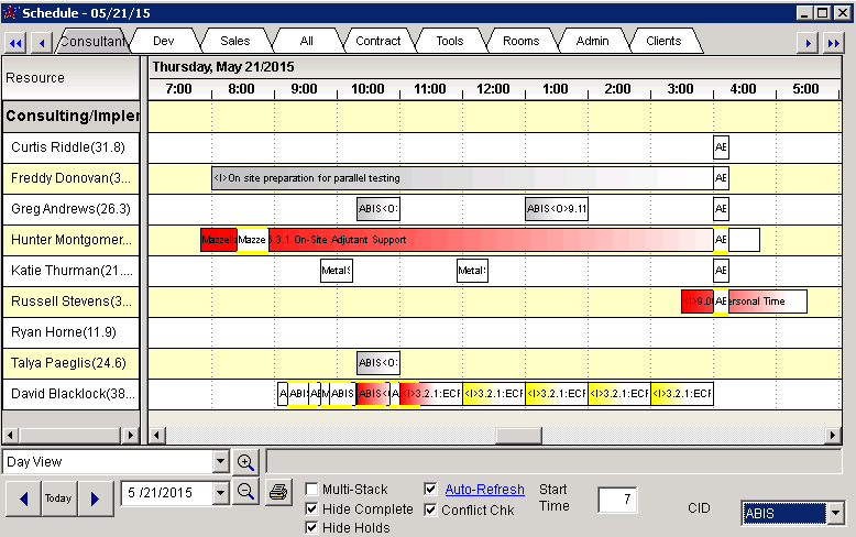 This screen shows the schedule of tasks assigned to all resources in the system with "Show on Schedule" checked in their resource attribute
